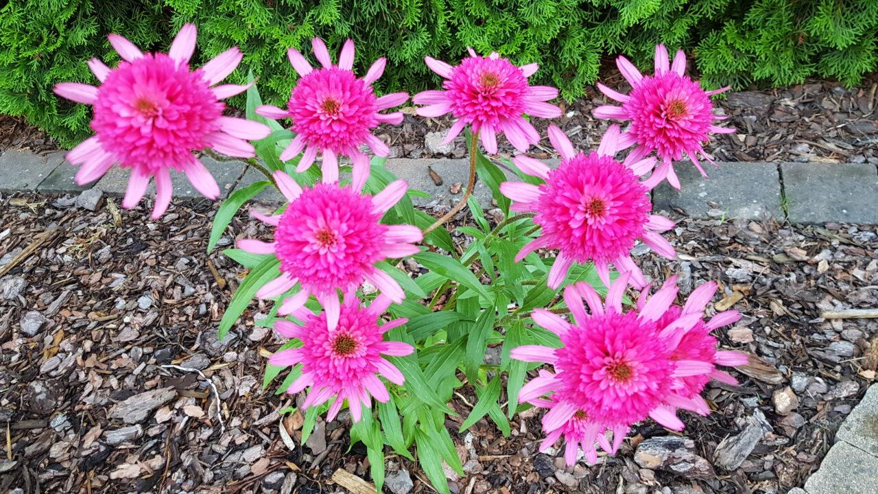 Na rabatach centralne miejsce zajmują jeżówki (Echinacea purpurea). Ich intensywne, różowe lub purpurowe płatki otaczające stożkowaty środek przyciągają wzrok i owady, takie jak pszczoły czy motyle. W promieniach słońca kwiaty te prezentują się szczególnie malowniczo, stając się jednym z najtrwalszych akcentów letnich.