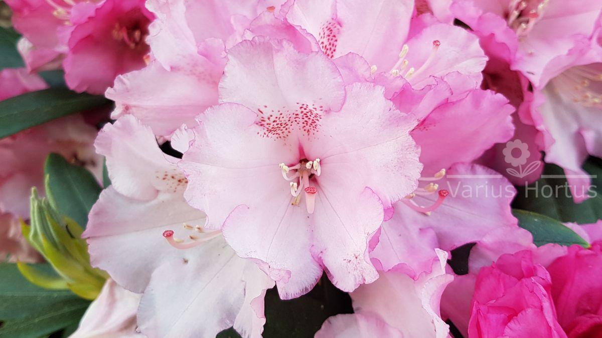 Kwiaty w pąku różowe, po rozkwitnięciu biało różowe, z różowymi plamkami na górnym płatku.