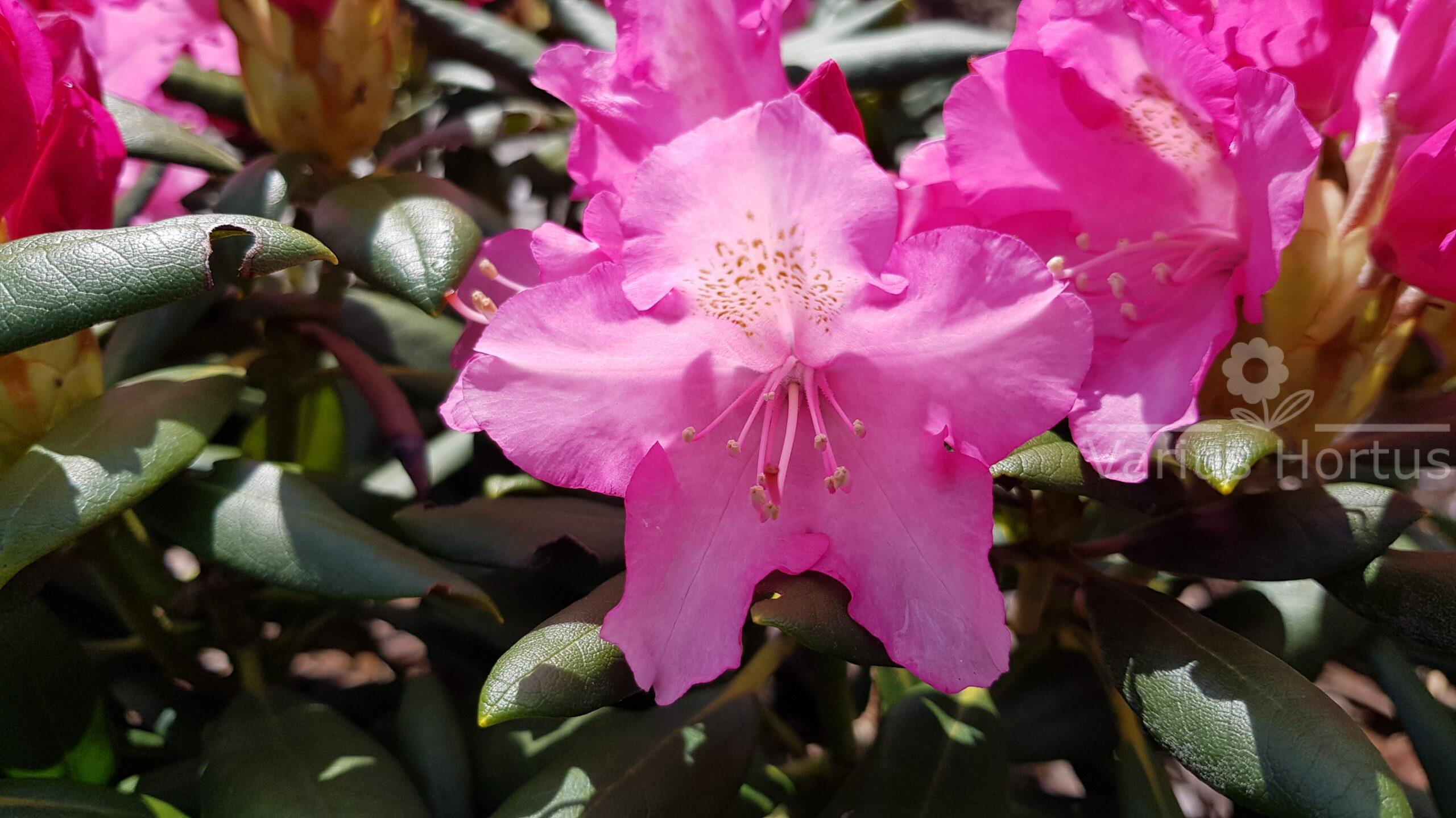 Różanecznik jakuszimański Marlis. Kwiaty w pąku ciemno różowe, po rozkwitnięciu różowe z jaśniejszym środkiem. Liście ciemnozielone.